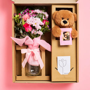 Delivered in a cardboard gift box (pictured 3rd image) to keep flowers and gifts safe.